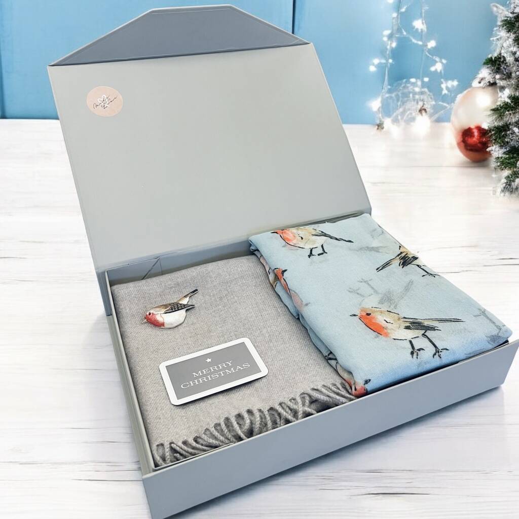 This beautifully packaged set includes a cozy Grey Cashmere Blend Winter Scarf, a delicate Sky Blue Scarf with Robin Bird Prints, and a charming Magnetic Robin Brooch. Presented in a stunning magnetic gift box with a choice of festive gift cards, it's the ideal ready-to-give present for the holiday season.