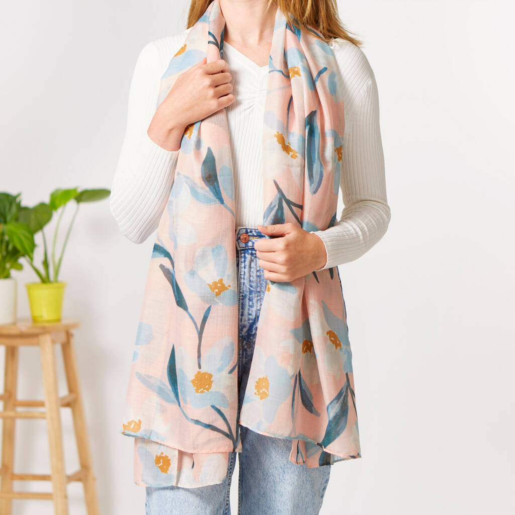 The soft and airy Pale Coral Pink hue serves as a subtle canvas for the intricate floral patterns, creating a visually enchanting piece. Crafted from a lightweight fabric, this scarf is designed for year-round wear, offering a versatile touch of sophistication to your ensemble in any season.
