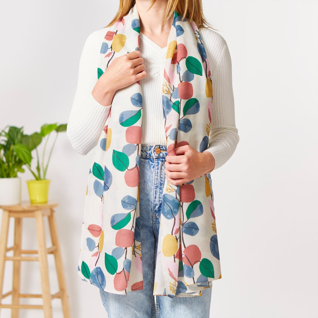 Introducing our Creamy Beige Scarf, a delightful accessory that seamlessly marries understated elegance with the vibrant hues of nature. Adorned with a lively array of colorful leaf prints, this scarf is a versatile masterpiece designed to complement your style throughout the year.